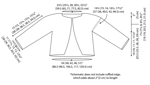 To Fit Bust: 34 (38, 42, 46, 50)” [86.5 (96.5, 106.5, 117, 129.5) cm].