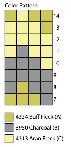 - RED HEART® Super Saver®: 1 skein each of 4334 Buff Fleck A, 3950 Charcoal B, 4313 Aran Fleck C.