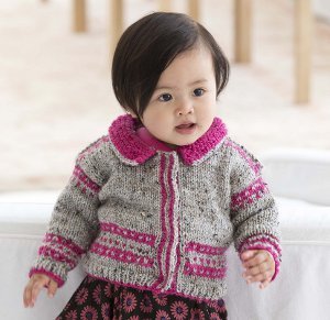 Dress up your little one in this sweet, polished baby cardigan pattern. The Chic Baby Cardigan features a cute turn-down collar, pretty ribbing detail along the bottom and cuff edges, and a girly pink stitch design. This adorable knit sweater is perfect for dressier occasions, but also works well for play dates and crawling around on the floor. Knitting the Chic Baby Cardigan is an fun, easy way to have the best dressed baby on the block.
