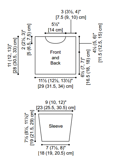 Finished SizeFinished Chest: 23 (25, 27)” [58 (63, 68) cm] Finished Length: 11 (12, 13)” [28 (30.5, 33) cm]