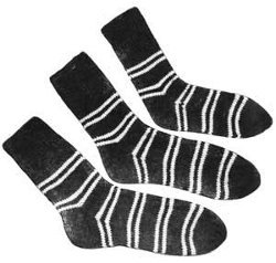Why buy socks when you can make them! Use this free knitting pattern to make a pair for yourself or as a gift. The black and white stripes make them wearable for either a boy or a girl.