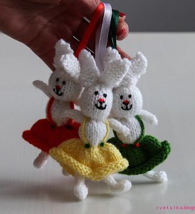 Very cute little bunnies which are fairly easy to make and work out well using DK yarn with larger needles too. You do need to have DPN's as the limbs require you to knit an icord and this is not easy with straight needles. It also does not tell you what to do about the straps but i used a crochet hook of the same size and made two chains long enough to cross over at the back like the picture shows. These would make a cute little gift to give with a chocolate egg at Easter.