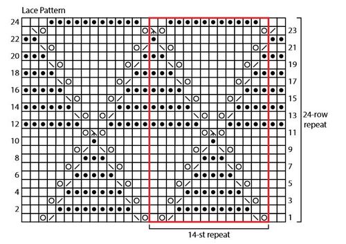 Row 15: K5, *k2tog, yo, k3, yo, ssk, k7. Repeat from *across, ending row with k2tog, yo, k3, yo, ssk, k5.