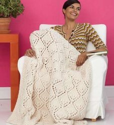 Looking for a soft and luxurious afghan? Use this free knitting pattern to cover up on chilly nights. The creamy color will certainly look great against a dark couch. This also makes a wonderful housewarming gift for that hard-to-shop-for couple that finally got a place of their own. Pair it with some microwave popcorn and a DVD or two and gift the happy couple a comfortable movie night! The possibilities are endless with this easy knit afghan.