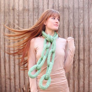 Why knit a simple knit scarf pattern when you can knit one that will make you stand out? The Fashionable Chain Scarf is a unique mint green knit scarf pattern that is sure to turn heads and make jaws drop. Although this scarf may look intimidating, it is basically twelve stockinette stitch rectangles that have been stitched into tubes. The tubes are then linked together in a chain formation. Do you have what it takes to rock the Fashionable Chain Scarf?