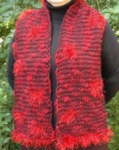 This knit scarf pattern is too hot to handle. The Hot Ember Scarf is a great knitting project for beginning knitters because it's knit almost entirely in garter stitch and features fuzzy fun fur yarn. The tufts of red fun fur yarn mimic the look of crackling flames in a warming fire. We love the way the Hot Ember Scarf looks in red, but black or another neutral would be a charming cold weather knit. The texture of the fun fur adds so much interest to this pattern, so no matter which color you choose, it's sure to be a winner!