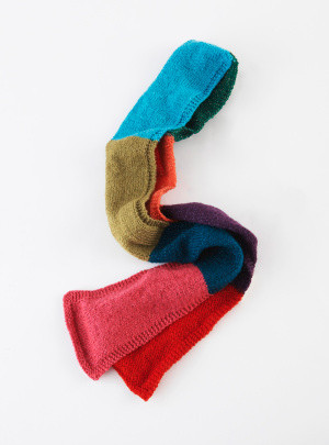 Continue as established, repeating Rows 1 and 2 and changing color as each is used up as follows: pea green, light blue, emerald, peach, purple, red. Work until final color block (red) measures about 1/2 in. (1.5 cm) less than previous color blocks. With red, knit 4 rows.