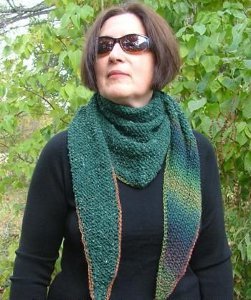 This gorgeous triangular-shaped knit scarf pattern is a great way to practice your basic knitting skills. The Seed Stitch Kerchief is a lovely shade of forest green with shades of light green and purples. This gorgeous knit accessory drapes nicely due to its shape and has just enough weight to lie flat over sweaters and under jackets. With a little knowledge of crochet, you can make the Seed Stitch Kerchief for yourself or for a friend.