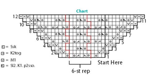 12th row: As 2nd row. 47 sts. Rep 1st to 12th rows for pat until Shawl measures 16" [40.5 cm] from beg, noting 2 sts will be increased every row. Cast off loosely.