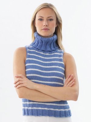 A sleeveless turtleneck is great for layering and perfect for places where the daytime temperatures are warm, not hot, and the evening temperatures can be a bit cool (think northern and mountain regions). I just like the way they look. The stripe of this pattern is pretty and I like the tall collar. The directions seem pretty straightforward, but I am not sure I would list this as an easy pattern. It takes some experience to be able to get the shaping right and to pick up stitches, etc.