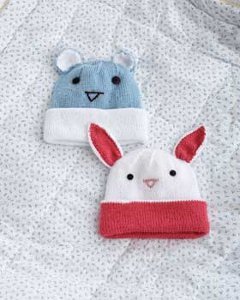 Keep your little critters ears warm with this adorable knit baby hat pattern. The Little Critter Baby Hat is a cute, quirky hat you'll love seeing on your baby as much as you'll love knitting it. The soft knit design features a basic construction with a fold-over brim. The pattern includes instructions for a bitty bear or a bitty bunny, and both take just one ball of yarn to complete. Knit one (or both) today for your little one.