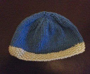 This knit baby hat pattern is a great basic to have in your knitting repertoire. The simple stockinette stitch is a good stitch for all knitters to know, especially because it is used so often in tiny little baby hats such as this one. This hat features a basic construction with a contrast colored brim. The featured colors in the picture are blue and light grey, but feel free to choose any color baby weight yarn to make this adorable tiny hat.