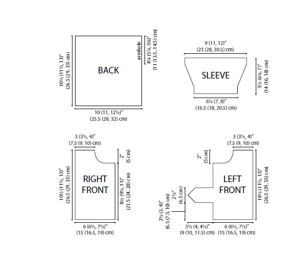 Finished Chest: 20 (22, 25)” (51 (56, 63.5) cm), buttoned