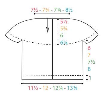 Note: Garment is worked from neck edge down. When yoke is complete, Body is joined in one piece and worked in rows. Sleeve edgings are worked in rnds on double-pointed needles.