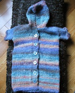 The baby coat is a perfect gift for that new baby - none of that polar fleece techno-world stuff, but a hand-knitted soft and cuddly gift of yourself with something that says baby in every stitch. I love it