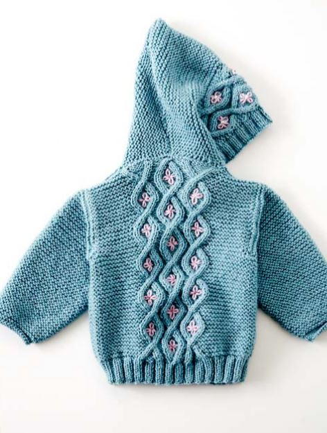 If you have a set of twins coming, you won't find cuter baby sweaters to knit than this Cabled Baby Cardigan Sweater set. The blue cardigan with the little flower embroideries is perfect for girls, and the cream, plain one is an instant classic for boys. The adorable little hood negates the need for a knit baby hat and makes it a perfect layering item for babies in the more volatile autumn and spring months. While the cables may seem complicated, just a little bit of practice and these baby cardigans will be a breeze.