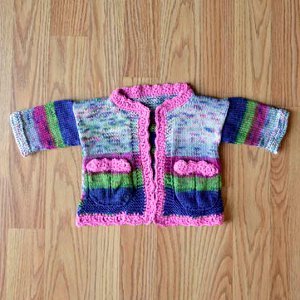 With sizing options from three months to two years old, the Little Cutie Cardigan is a darling pattern you'll love coming back to again and again. This darling knit baby cardigan pattern is a brightly colored beauty your little girl will adore. A fun, multi-colored bodice is adorned with a pretty scalloped edge. Two pockets make this little cardi a functional garment for indoor and outdoor wear.