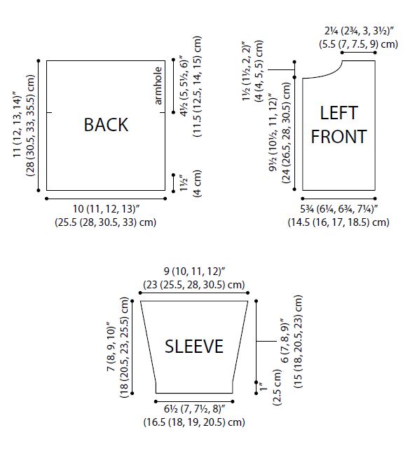 Finished Chest: 20 (22, 24, 26)” [51 (56, 61, 66) cm]