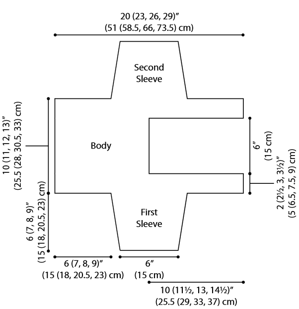 Cast on 20 (23, 26, 29) sts for front, knit to end of row—40 (46, 52, 58) sts.