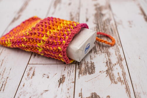 "I love how a simple yarn over can turn a garter stitch swatch into a thick woven texture that is perfect for a soap sack. This is excellent for beginners or TV knitting. If you can knit a stitch you can make this! Soap Sacks are a great way to use up your cotton stash and give back to the community. I was excited to get involved but struggled to find knitting patterns, so I wanted to provide an option for other knitters out there."