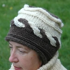 Take cable stitch knitting to the next level with this cute and cozy knit hat pattern. The Cable Curl Cap is an interesting white and gray hat divided by a two-color cable. The two colors swirl together creating the look of interlocking waves or a chocolate and vanilla ice cream cone. The Cable Curl Cap is a fun and funky way to stay warm as well as a great pattern to practice the cable stitch.