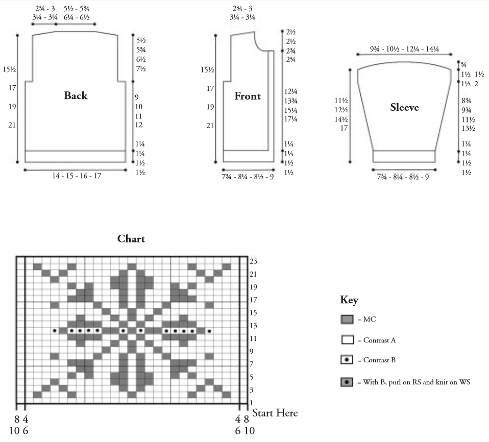 Collar: Sew shoulder seams. With RS of work facing, MC and smaller needles, pick up and knit 17 (18-19- 19) sts up right front neck edge from marker to shoulder. K27 (29-31-33) from Back st holder, dec 2 sts evenly across. Pick up and knit 17 (18-19- 19) sts from shoulder to marker on left front neck edge. 59 (63-67-69) sts.