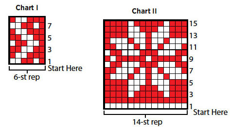 All sizes: Work Chart II to end of chart, reading rows from right to left, noting 14-st rep will be worked 11 (12-13-14) times.