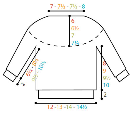 Numbers for each size are shown in the same color throughout the pattern. When only one number is given in black, it applies to all sizes.