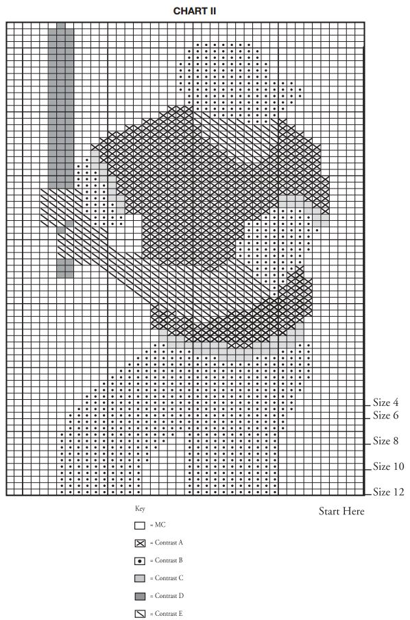 Next row: With MC, P7 (9-12-14- 16). Work 2nd row of Chart I or II or III. With MC, purl to end of row. Chart I or II or III is now in position.