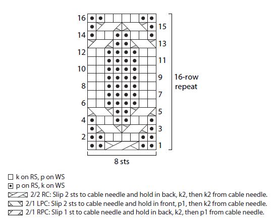 Rows 5–16: Repeat last 2 rows 6 more times, working next row of Cable pattern in each row until all 16 rows of Cable pattern have been worked.