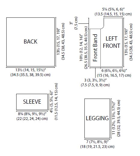 Finished Chest: 27 (28, 30, 31)” (68.5 (71, 76, 78.5) cm)