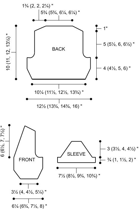 Bind off 3 (4, 5, 6) sts at beginning of next 2 rows–20 (22, 24, 26) sts. Dec 1 st each side next row, then every other row 1 (2, 2, 2) times, then every fourth row 3 (3, 4, 5) times–10 sts. Bind off 3 sts at beginning of next 2 rows.
