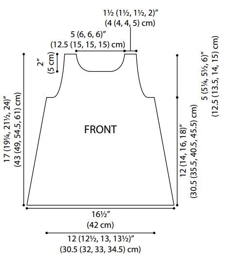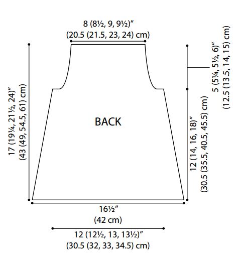 Note: All sizes begin with the same number of stitches at the lower edge. Side decreases will form the correct chest measurement for each size.