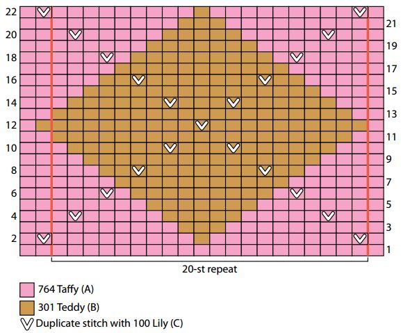 With C, work duplicate stitch V’s over intarsia diamonds as shown in chart.
