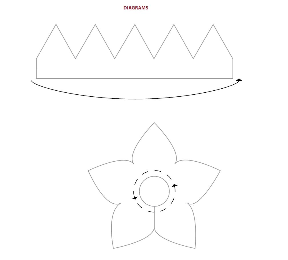 Sew cast on and cast off edges tog to form ring. (See diagrams on page 2). Thread a length of yarn through eyelets at inner edge of each ring to gather ring closed. Stack petal cluster with A on bottom, and 2 MC clusters on top. Sew petal clusters tog at centers. Optional: Sew small jingle bells to center.