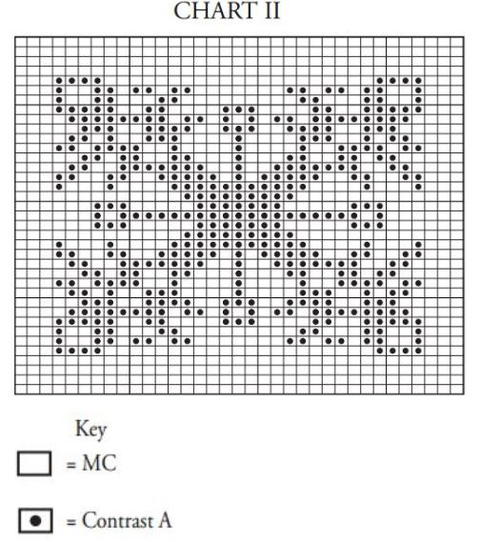 Note: When working from chart, carry yarn not in use loosely across WS of work but never over more than 5 sts. When it must pass over more than 5 sts, weave it over and under color in use on next st or at centre point of sts it passes over. The colors are never twisted around one another.