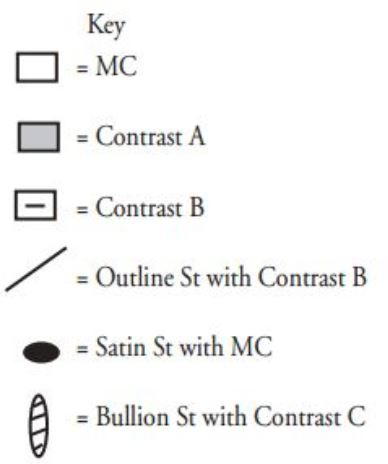Note: When working from chart, wind small balls of the colors to be used, one for each separate area of color in the design. Start new colors at appropriate points. To change colors, twist the two colors around each other where they meet, on WS, to avoid a hole.