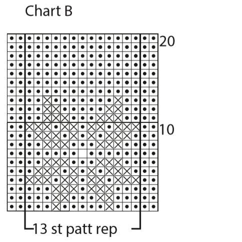 Beg and ending rows as indicated, using the fair isle technique and repeating the 13 st patt rep 3 times across each row, cont in patt from chart B, which is worked entirely in st st beg with a knit row as folls: