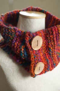 This gorgeous arts and crafts style cowl is a delight to wear as well as look at. The Color Riot Cowl is a simple knit cowl pattern featuring two large, whimsical buttons. Upon first glance, the cowl appears to be just a nubby, orange cowl. However, after a closer look, the all the pretty details of the yarn come to life. Deep purples, brilliant blues, mossy greens, vibrant magentas, and breathtaking strands of rich red intertwine to make a chaotic, beautiful cowl.