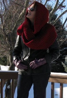 nfinity Hooded Cowl This super bulky hood with twisted scarf attached can be worn as a big drape cowl or wrapped around the shoulders for a loose thick shoulder cowl The hood can be up or down on the neck for more shoulder warmth I used mm US needles to make sure the stitches were a bit loose and to create more stretch and drape to the fabric Gauge is less important than the soft drape Yarn Lion Brand Wool-Ease Thick Quick gms balls mine is cranberry Needles mm A couple of safety pins to mark spots One size adult Scarf Cast on stitches Work in garter stitch knit every row until inches have been worked Cast off all stitches Laying the scarf flat put one twist in the middle Each end as it now lays is the right side up put a safety pin on the right side so you…Read More dont twist it back Hood pick up stitches from the right side of one end of the scarf Cast On new stitches then pick up stitches from the right side of the other end of the scarf there are close up photos below to show these details including the x ribbing at the neck created by the next four rows Next four rows Rows Knit stitches Purl knit times purl knit Rows knit knit purl times knit knit Rest of hood Knit all stitches in every row garter stitch Work until hood from cast on stitches measures inches Mark center of row stitches marker stitches Decrease row Knit to stitches before marker knit together move marker knit together knit to end Work next row all knits Repeat the row decrease pattern until hood is inches from cast on edge Cast off all remaining stitches Sew the top of head seam last cast off stitches folded in half to form a hood Thats it worn as an infinity scarf look We finally got some snow in Canada Jan th Latest snow day that I can ever remember see the single twist in the scarf detail of the back of neck cast on stitches and the ribbing to define the neck