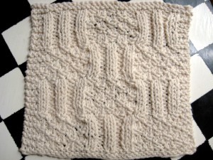 This is one of those patterns that looks complicated but really isn't. It looks like cable stitches but is actually just done with knit and purl stitches. That gives it a great texture, perfect for washing. The tan color is okay but I would go for some either some primary colors or really bright ones.