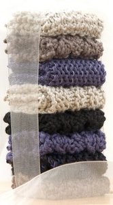 The four patterns in this group of dish cloths are garter stitch, garter stitch stripe (knit 5 rows, purl 1 row), sand stitch (seed stitch 1 row, knit 1 row), and dewdrop pattern, which is more open. Any or all of these make very nice wash cloths and work up quickly.