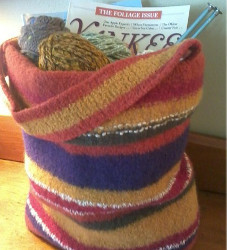 Store all your yarn and needles in this Felted Knitting Bag. A great beginner's project, this bag is durable and has plenty of room for all your things. Use this easy knitting pattern to make your own simple tote bag.