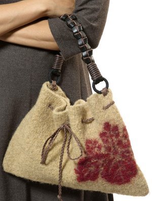 This is a nice, cozy looking bag made of 100% wool that is felted to give it the fuzzy look. I love the warm color of the tote and how the floral motif that runs from the front to the back of the bag. With its leather handle and woven cord, this tote is totally stylish and chic!