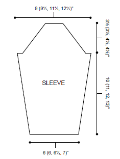 Begin with a knit row, work 10 rows in St st. Change to B and larger needles, work in St st shaping sleeve by increase one st at beginning and end of every 8th (6th, 6th, 4th) row 8 (9, 12, 14) times–46 (48, 56, 62) sts. Work even until piece measures 10 (11, 12, 13)” from beginning allowing edge to roll end by working a wrong side row.