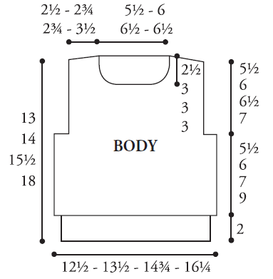 Shape armholes: Cast off 4 (4-6-6) sts beg next 2 rows. 49 (53-55-61) sts. Cont even until armhole measures 3½ (3½-4-4½) ins [9 (9-10-11.5) cm], ending with a purl row.