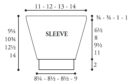 With MC and smaller needles, cast on 33 (35-35-37) sts. Work 2 ins [5 cm] in (K1. P1) ribbing as given for Back, inc 4 sts evenly across last row. 37 (39-39-41) sts. Change to larger needles and proceed in stocking st for 4 rows. Inc 1 st each end of needle on next and every following 4th row until there are 41 (47-47-53) sts, then on every following 6th row until there are 49 (55-59-63) sts. Cont even until work from beg measures 8½ (10-11½-13) ins [21.5 (25.5-29-33) cm], ending with a purl row. Place markers at each end of last row. Work 4 (4-6-6) rows even. Cast off.
