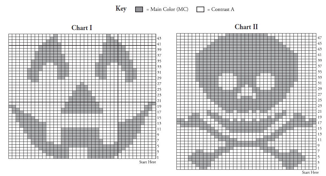 Skull and Crossbones Version only: Change to larger needles and proceed in stocking st for 2 (4-8-12) rows.