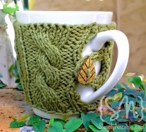 This adorable cable knit cozy pattern is a great way to show your love of the environment and keep your drink from burning your hands at the same time. The Cabled Leaf cozy is a sweet knit cozy fastened with a little leaf button. This simple cozy pattern is a great way to get rid of excess green yarn or any other color worsted weight fiber. The Cabled Leaf Cozy makes a great gift for the coffee, tea, or nature lover in your life.