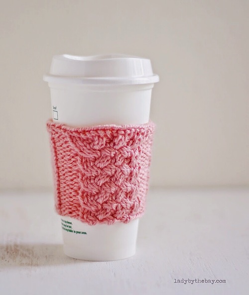 This is a cute stash buster pattern! Although it is marked easy you will have to know how to work with a cable needle. If you don't, this might be a good pattern to learn with and practice on. So dig into your leftover yarn and find a color you like. This cozy is eco-friendly too since you won't need a paper cup sleeve if you have it.